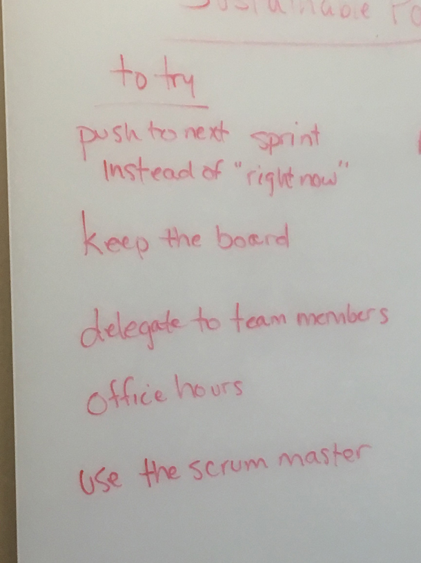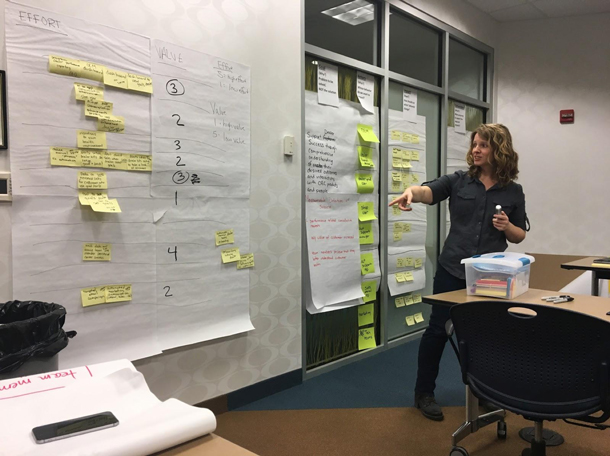 Our first step was to get off site for a day where we could be free of the distractions in the office. This approach really helped us open our minds to new and different ideas. We started the outing with a team retrospective, a meeting to discuss what was working, what wasn’t working, and to decide on next steps.