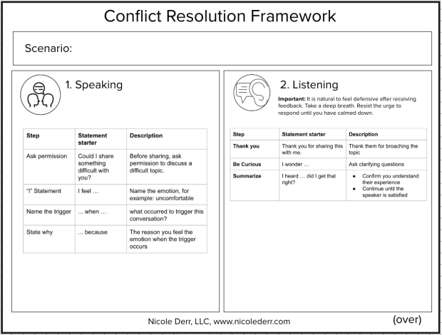 A worksheet that helps us work through the four steps to conflict resolution: Speaking, Listening, Resolving, and Checking In. You can use it to prepare for a difficult conversation or use it as a tool to aid conversation with the other party in the moment.