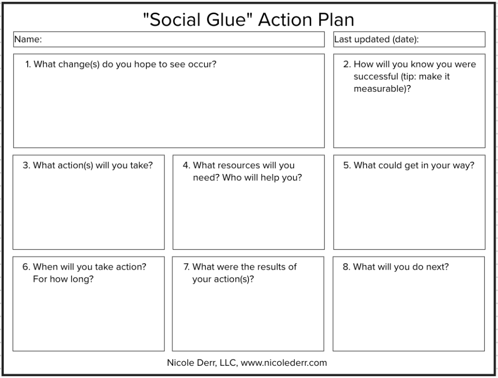 A canvas designed to help you work through a plan to increase “social glue”, the stuff that holds us together as a community, in your workplace, neighborhood, or social circle. It helps you consider topics like what success looks like, what might get in your way, and who can help you.