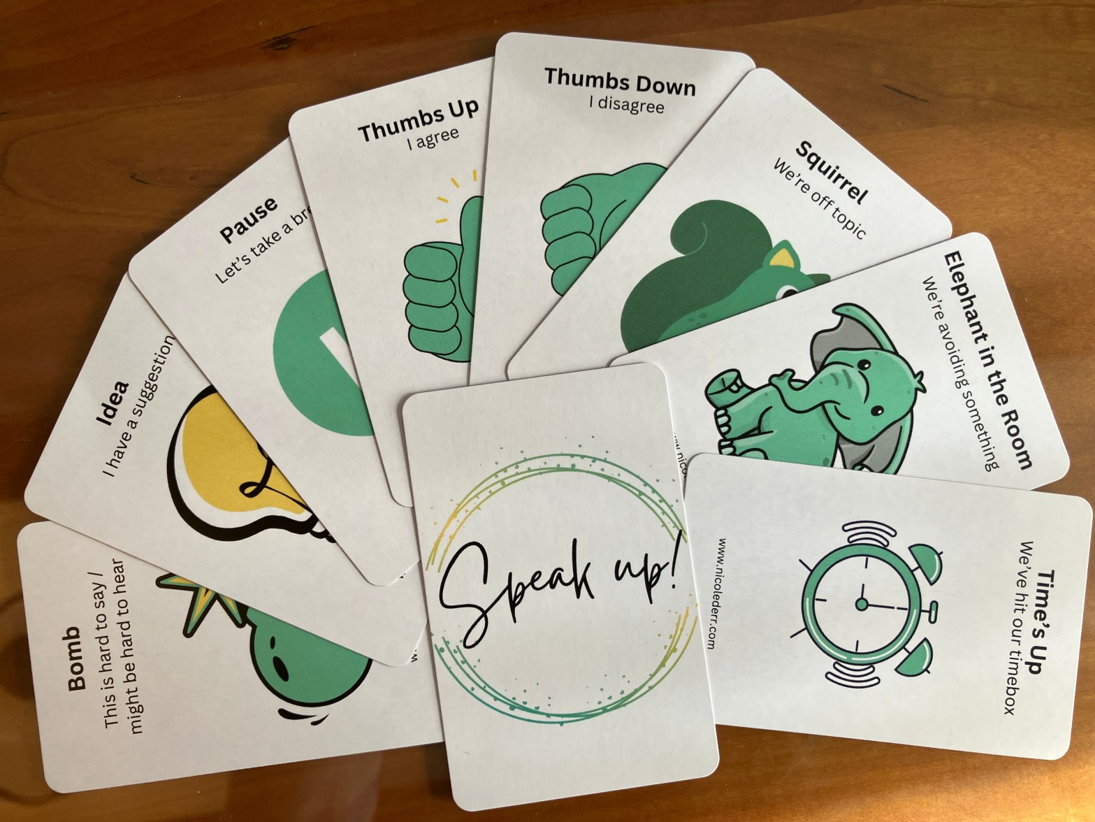- Option 1: Deal a complete set to each team member. When something difficult needs to be said, but you’re having trouble getting the words out, simply throw the approrpriate card onto the table.